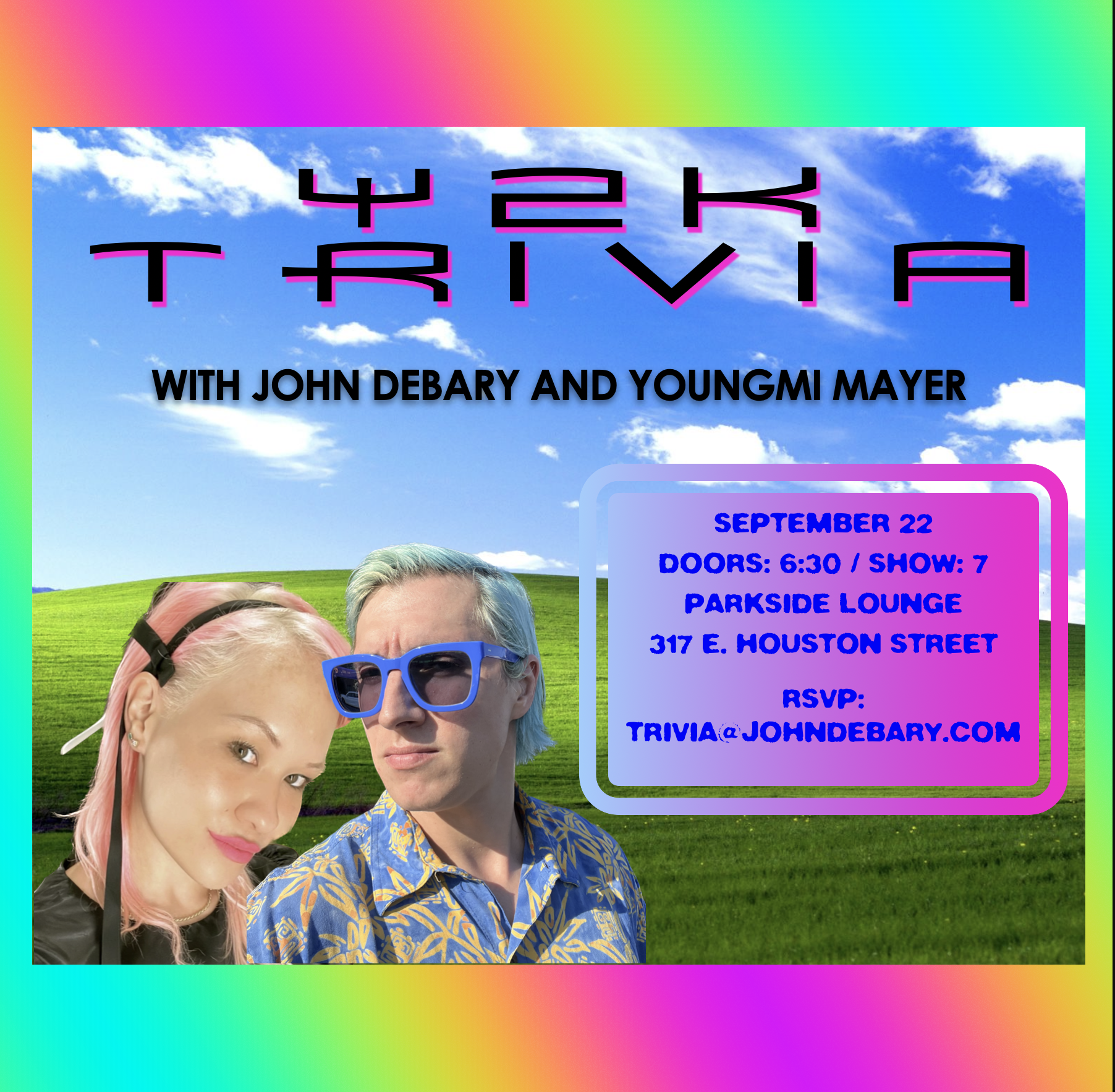 Your Custom Text Here Join me and Youngmi Mayer on September 22 for a night of Y2K trivia! There will be prizes and a surprisingly good 2000s playlist. Use the form below to register! Name * First Name Last Name Email * Team Name Etc. Any additional info, questions, etc Thank you!